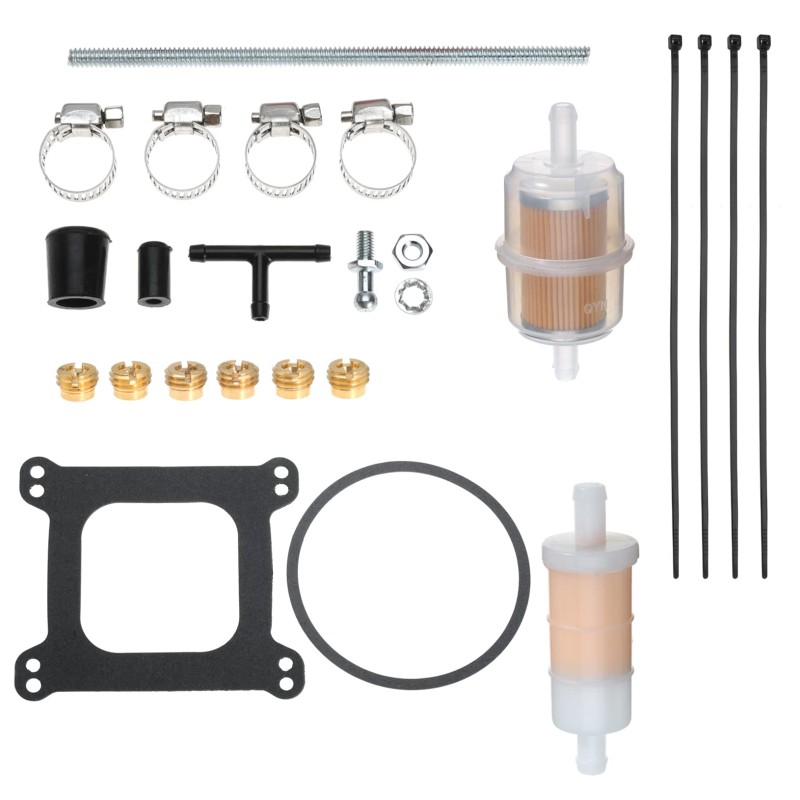 包装清单内含 1 个化油器、1 个喇叭口密封垫片、1 个方腔底座密封垫片、1 个空气滤清器螺栓、2 个燃油滤清器、4 个管夹、1 根燃油管及其他配套小零件(配件规格与数量以实物图为准)。温馨提示:本包装附赠安装说明书。