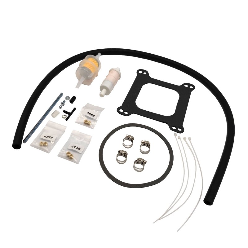 包装清单内含 1 个化油器、1 个喇叭口密封垫片、1 个方腔底座密封垫片、1 个空气滤清器螺栓、2 个燃油滤清器、4 个管夹、1 根燃油管及其他配套小零件。注意:本包装不含安装说明书。