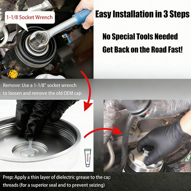 摒弃原厂座盖的圆角设计,使用 1 1/8" 套筒扳手即可轻松拆卸旧盖并完成新盖安装。建议在螺纹和密封圈处涂抹绝缘润滑脂,可提升密封效果。