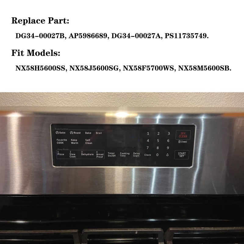 这款薄膜开关触控板是专为三星特定型号烤箱打造的原厂级替换配件,适配机型包括 NX58H5600SS、NX58J5600SG、NX58F5700WS、NX58M5600SB,兼容替换编号为 DG34-00027B、AP5986689、DG34-00027A、PS11735749,是解决烤箱触控失灵、按键无响应、操作紊乱等故障的理想配件,适用于家庭烤箱维修或家电维修店备用。