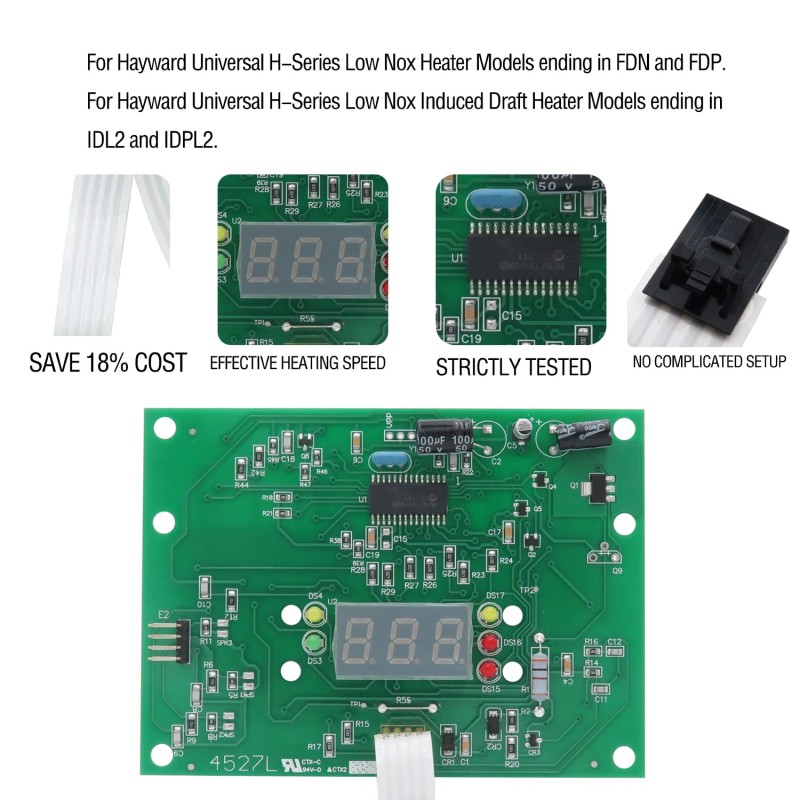 本款显示屏控制板专为 Hayward 亨沃低氮引风式泳池加热器设计,兼容型号覆盖 W3H150FDN、W3H150FDP、W3H200FDN、W3H200FDP、H400FDNASME、H250FDPASME、H500FDN、H500FDP 等全系列同规格设备,同时适配通用 H 系列加热器机型,完美匹配原厂尺寸,直接替换即可使用。