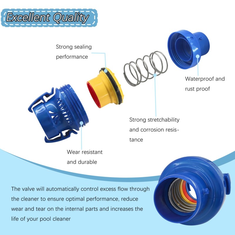 调节阀的核心作用是自动管控清洁机的过水量,避免因水流过大导致设备超负荷运行:通过精准调节水流,确保清洁机始终处于最佳工作状态,有效减少内部叶轮、轴承等核心零件的磨损,降低故障发生率,大幅延长泳池清洁机的整体使用寿命。