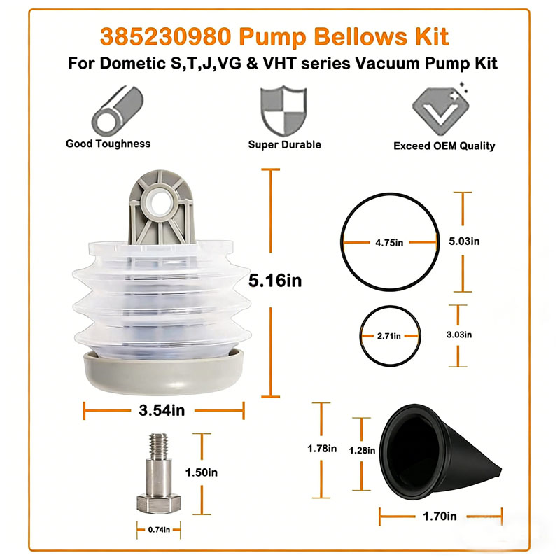 适用范围:385230980泵波纹管套件O型圈套件,适用于更换磨损或损坏的波纹管,S型真空泵、VG4真空泵和T型排放泵的圆顶波纹管组件。Duckbill阀门套件替换Dometic 385310076的配件,与Sealand真空发生器S&T系列泵型号S12D S12DAB S24D S32D S115A S12 52A S32 T12 T24 T32兼容。